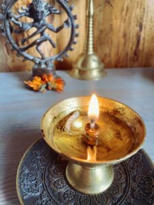 De préference à pratiquer avec un diya, une lampe indienne remplie de ghee avec une mèche en coton.