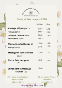 L’abhyanga est un massage complet du corps à l’huile chaude, relaxant et énergétisant à la fois. Les gestes dynamiques et vigoureux du thérapiste stimulent la circulation du sang et draine le système lymphatique, détend le système nerveux et parasympathique, nourrit les tissus, muscles, articulations et ligaments. Ce voyage à l’intérieur de soi-même est un rituel de santé, à pratiquer régulièrement pour un bien-être physique, psychique et spirituel. Il favorise particulièrement le sommeil et son effet rajeunissant et régénerant devient une addiction bénéfique. Il peut être suivi d’un gommage à base de plantes pour kapha et doit être suivi d’une douche chaude dans les trois heures.